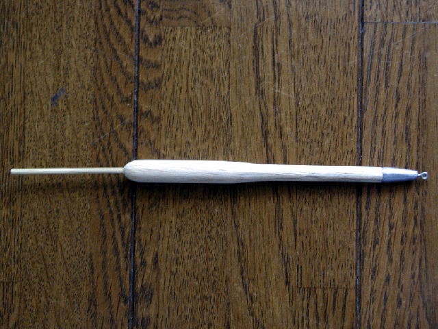 そして慎重に中心を出しながら浮きトップ用の心棒を差し込みます。これは焼き鳥の竹串かなんかで十分です。あとで浮きトップを刺すときには2cmほどにカットしますが、下塗り塗装が終了するまでは長いままにしておき、握り棒にしておきます。